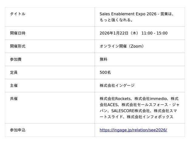 顧客対応クラウド「Re:lation(リレーション)」を提供し、6,000社以上(※1)の導入実績を誇る株式会社インゲージ(本社:大阪府大阪市、代表取締役:和田 哲也)は、2026年1月22日(木)に、オンラインカンファレンス「Sales Enablement Expo 2026 - 営業は、もっと強くなれる。」を主催・開催することをお知らせします。