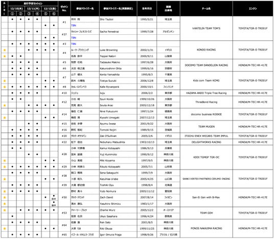 合同テスト・ルーキーテスト エントリーリスト(12/5時点)