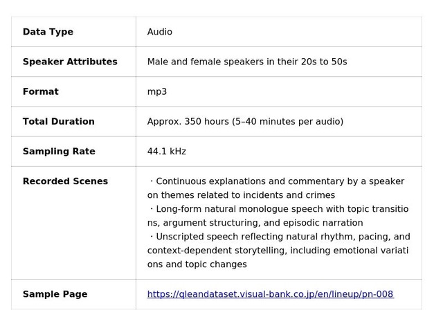 Visual Bank株式会社(東京都港区、代表取締役CEO 永井真之、以下「Visual Bank」)は、傘下の株式会社アマナイメージズを通じて展開するAI学習用データソリューション『Qlean Dataset(キュリンデータセット)』において、『日本語・1話者・事件犯罪テーマトーク音声コーパスデータセット』の提供を開始しました。本データセットは、事件・犯罪を題材とした一人語りの音声を収録しており、音声認識(ASR)、自然言語処理(NLP)、生成AI基盤モデルの研究・開発に活用できます。