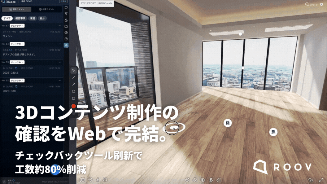 今回の刷新では、3Dモデル上での直接コメント、資料添付、指示履歴の一元管理を強化しました。加えて、UI/操作性の改善およびAI搭載により、レビュー・修正の精度と効率を向上。これらのアップデートにより、確認工数を従来比で約80%削減(当社調べ)。デベロッパーや設計者などのROOV導入に伴う確認時間を、年間で約10,250時間削減する見込みです。※ROOV walk 年間500タイプ、ROOV.space 年間100プロジェクトの納品を想定