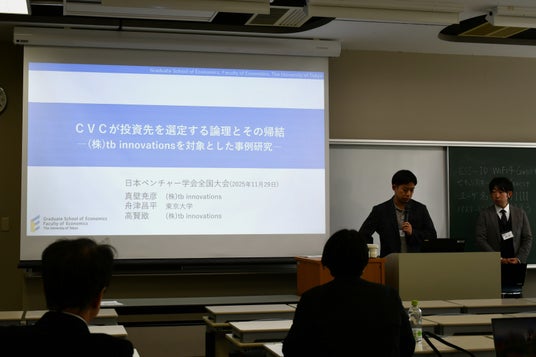 東京貿易グループ(東京都中央区、代表取締役社長 坪内秀介)のコーポレートベンチャーキャピタル(以下、CVC)運営企業である株式会社tb innovations(以下TIT、東京都中央区、代表取締役社長 高賢敃)では、2020年に組成したファンド「ネクスト新事業新技術1号投資事業有限責任組合」(以下「当ファンド」)の事例について、東京大学大学院経済学研究科講師の舟津昌平氏と共同で、これまでの投資活動を分析し、専門家の視点を取り入れた客観的な振り返りを行うことで、得られた知見を今後へ活用すべく学術研究を進めています。その一環として、先日11月29日に開催された日本ベンチャー学会全国大会に登壇し、ここまでの研究状況を発表しました。