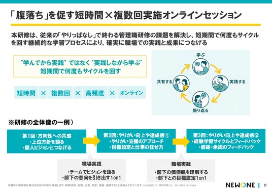 こうした背景のもと、NEWONEでは管理職が抱える、研修で学習したことを日常業務に活かしきれずにいる「やりっぱなし」課題を根本から見直し、学びを現場でより早く定着させるため、“短時間かつ高頻度で実践しながら学ぶ”研修アプローチへと進化させました。これにより、研修で学んだ内容を日常業務に落とし込み、行動と成果に早期につなげることを目指しています。