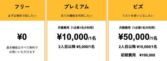 無料のフリープランと、オンライン広報に必要なフル機能が使える月額1万円~(税別)のプレミアムプラン、メディアリストの管理を当社が代行する月額5万円~(税別)のビズプランがあります。