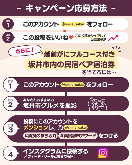 1.坂井市公式Instagram(https://www.instagram.com/smile_sakai/ )をフォロー