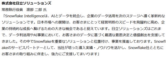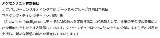日本国内においても、Snowflake Intelligenceのパブリックプレビュー版を通じて、AIエージェントを活用した業務変革に取り組む企業が増えており、データとAIを活用した競争力強化の成果を実感されるケースが広がっています。こうした国内企業の状況を踏まえ、Snowflake合同会社 社長執行役員の浮田竜路は次のように述べています。