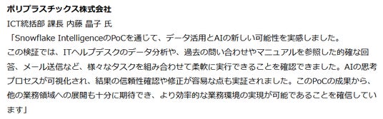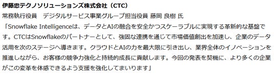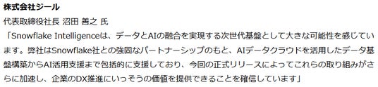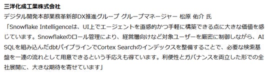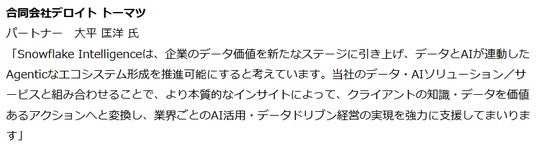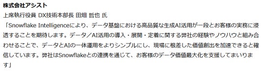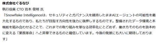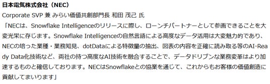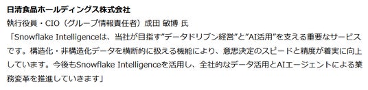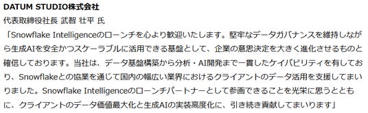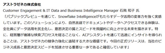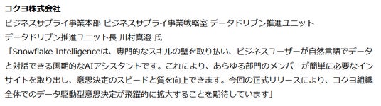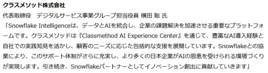この他にも、様々な業界の企業がSnowflake Intelligenceの導入を進めており、業務効率化とデータドリブンな意思決定の実現に向けた取り組みを加速させています。その代表的な事例として、以下の企業からもコメントをいただいています。