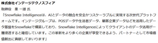 「日本企業では今、データとAIの活用が競争力強化の鍵となっています。Snowflake Intelligenceは、自然言語での質問だけでデータの検索・分析やチャート作成まで行える革新的なプラットフォームであり、構造化データと非構造化データを直感的に扱える環境を実現します。Snowflakeは長年、厳格なデータガバナンスのもと日本企業のデータ基盤を支援してきました。今回の一般提供開始により、企業規模を問わずAIを活用した意思決定と業務変革をさらに加速し、より速く賢いビジネス創出を後押ししてまいります」