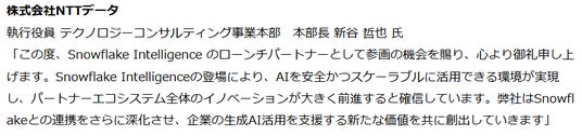 Snowflakeは今後も、企業のAIエージェント導入を支援し、データとAIを活用した競争力強化を促進するパートナーエコシステムとの連携も一層強化してまいります。以下に、Snowflake Intelligenceに関するローンチパートナーからのコメントをご紹介します。