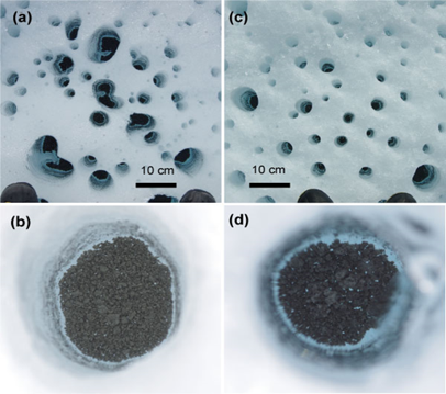 図2:グリーンランド氷床上のクリオコナイトホール(a)(b) クレバス帯のホール、深さ約10 cm(c)(d)平坦帯のホール。深さは約30 cm