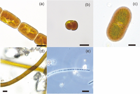 図3:クリオコナイトホール内に生息する雪氷藻類(a, b, c)とシアノバクテリア(d,e)。bとdはどのホールにも広く分布するが、浅いホールでは雪氷藻類(a,c)が優占し、深いホールではシアノバクテリア(e)が優占する。