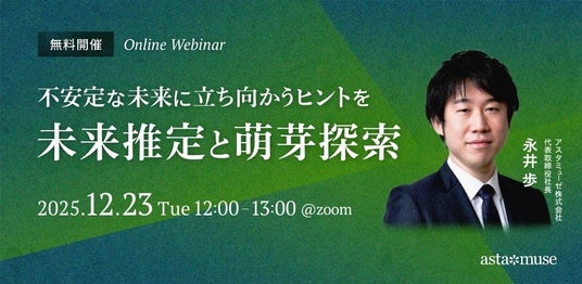 今回開催するウェビナー「戦略策定のための未来推定・萌芽探索」では、様々な技術・ニーズ・ビジネスモデルについて「どんな」未来が「いつ」訪れるか、「どんな融合・新結合が」起こるかを推定する未来推定・萌芽探索のアプローチについて、最新の分析事例を交えてお話します。不安定な未来にどう立ち向かうかを考えるヒントになる60分です。