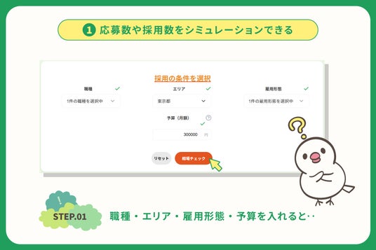 募集職種・募集エリア・雇用形態・月額運用予算を入力するだけで応募数(応募単価)や採用数(採用単価)を予測することができます。