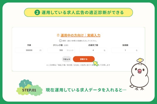 現在求人広告を運用されている企業様向けに、運用中の求人広告のスコアを用いて応募数や採用コストの適正診断を行えます。