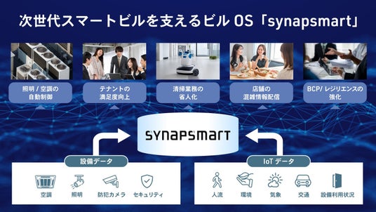 「synapsmart」は、ソフトバンクが持つICT(情報通信技術)やデータ基盤に関する技術、本社が入居する「東京ポートシティ竹芝」でのスマートシティの取り組みを通して得た知見に加えて、スマートビルの構築支援などを行うグループ会社のSynapSparkが持つ建築設計と都市開発の専門知識やビル設備・運営に関するノウハウを生かして開発した、ビルOSソリューションです。最小限の改修でビル内のあらゆる設備やシステムをネットワークで接続し、データを一元的に可視化して管理することで、運用業務の省人化やエネルギー消費の削減に寄与します。また、データに基づく室内環境の最適化やオフィススペースの効率化、人流データを活用した販促活動が可能になることで、ビルに入居する企業や飲食店などのテナントの運営効率の向上や、テナントの従業員や来訪者の満足度向上にも貢献します。「synapsmart」は、新築ビルと既存ビルのいずれにも導入可能で、単一のビルだけでなく複数のビルや拠点のデータを横断的に管理することもできます。今後はAI(人工知能)の活用や外部システム・アプリケーションとの連携により、「synapsmart」の機能とサービスを進化させ、ビルオーナーや管理者、入居者が抱える課題やニーズに応じた柔軟で付加価値の高いビル運営の実現を目指します。