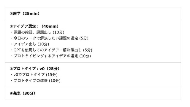 ケーススタディではなく、参加者ご自身が持ち込んだ現場の課題をテーマにします。作成したプロトタイプは持ち帰ることができるため、翌日からすぐにステークホルダーへの提案やユーザーヒアリングに活用可能です。