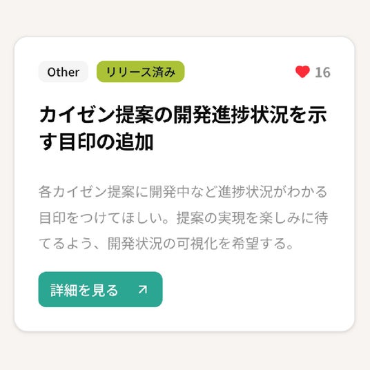 提案カード各提案は、カテゴリバッジ、ステータスバッジ(提案中/開発中/リリース済み)、イイネ数、タイトル、要約、リリース予定、詳細リンクを含むカードとして表示