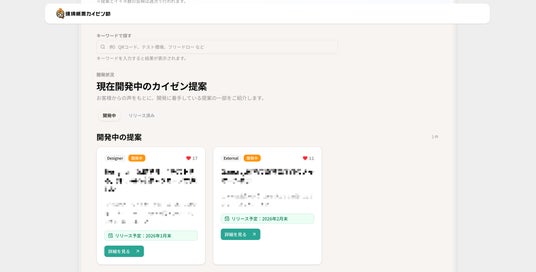 開発中・リリース済みの提案を確認できるセクション。タブ切り替えで表示を変更し、件数を一目で把握。ユーザーは「自分の要望がどのステータスにあるか」をいつでも確認可能
