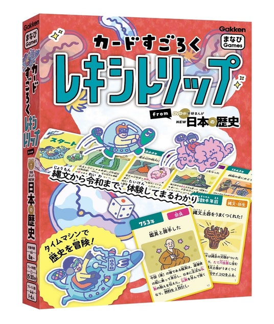 タイムマシンに乗って歴史を冒険! 1~6人で遊べるカードゲームです。歴史を知らなくても楽しめるゲームから、知っているとより楽しいゲームまで、遊び方はバラエティ豊かな4種類! クリスマスなどのプレゼントとしてもおすすめです。