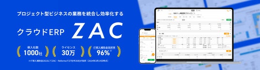 クラウドERP「ZAC」は損益管理、プロジェクト管理、管理会計、内部統制、決算早期化を実現する統合型の基幹業務システムです。業務効率化と的確な経営判断を支援し、企業の継続的な成長を担う経営基盤として、IT業、システム業、広告業・クリエイティブ業、士業、コンサルティング業をはじめとした累計1000社を超える企業様に導入いただいております。モジュール(機能)単位で導入範囲やライセンス数を選択でき、導入後も必要に応じて機能やライセンスの追加が可能であることも特徴です。