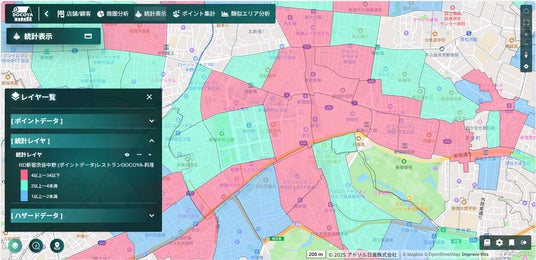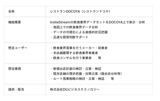 「レストランDOCOYA」は、デジタルガレージが開発した業界特化型データ収集基盤「InsiteStream」に、アドソル日進が長年のGIS(地理情報システム)開発実績をもとに提供するSaaS型商圏分析ソリューション「DOCOYA」を組み合わせた、飲食業界や食品メーカー、サービス業向けのデータ分析ツールです。