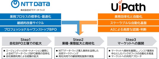 こうした社会的・経済的背景を踏まえ、NTTデータ・ウィズがBPO領域で培ってきた業務知見と、UiPathが展開するAIを活用したエージェンティックオートメーションの技術を融合し、バックオフィス業務の高度な自動化を共同で推進してまいります。