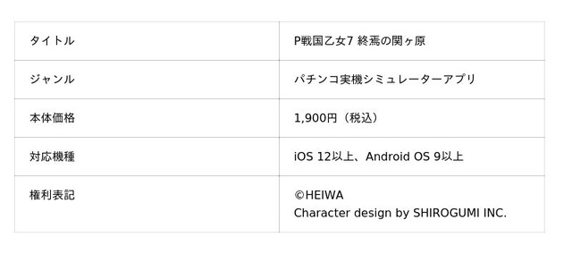 本アプリは、2025年1月にホール導入された『P戦国乙女7 終焉の関ヶ原』を忠実に再現した買切り版の実機シミュレーターアプリです。基本的な遊技を無制限に楽しめるほか、本アプリ独自の鑑賞モードを搭載しています。