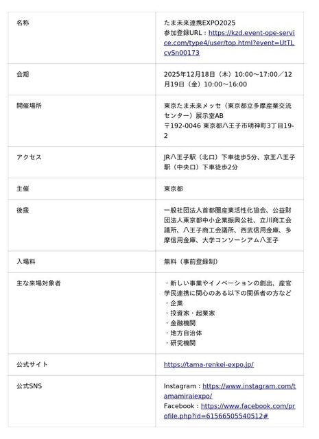 東京都は、多摩地域で唯一の産業振興及び広域的な産業交流を目的とする展示会「たま未来連携EXPO2025」を、東京たま未来メッセ(東京都立産業交流センター)において2025年12月18日(木)、19日(金)の2日間開催いたします。