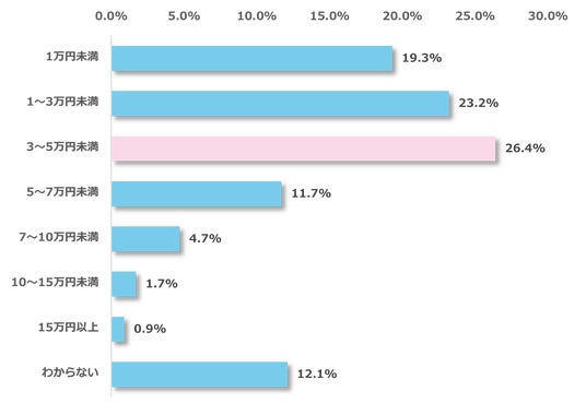 受験サポートにかけている毎月の平均費用について調査したところ、最多回答は「3万円以上5万円未満(26.4%)」でした。また、3万円以上と回答した家庭は全体の45.4%となり、“ほぼ半数に迫る”水準であることがわかりました。