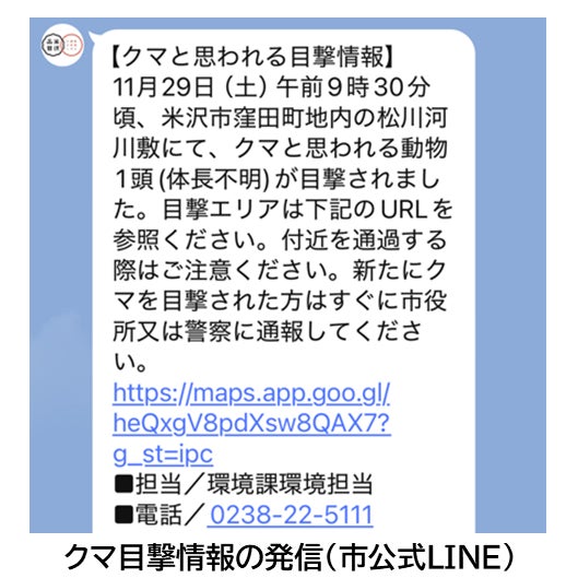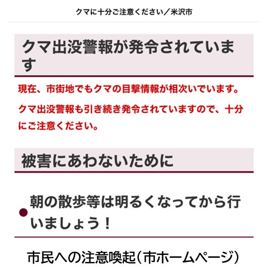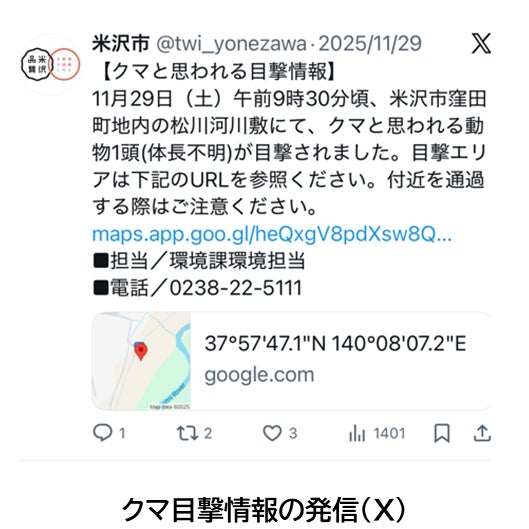 1.クマ出没情報の周知強化米沢市LINE公式アカウントやXでのクマ目撃情報の発信、広報車によるアナウンスの実施