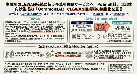 行政用生成AIのトップランナーであるPolimill株式会社(ポリミル、本社:東京都港区、代表取締役:伊藤あやめ/谷口野乃花)は、全国約600の自治体に導入され、行政シェアNo.1(※当社2025年12月調べ、他のサービスとバンドルされていないシングルのプロダクトにおいて)の生成AI『QommonsAI(コモンズAI)』について、LGWAN(総合行政ネットワーク)環境で利用する際の「LGWAN接続料」を無償で提供することを発表しました。QommonsAIをLGWAN上で利用しても、インターネット接続と同じように、各自治体1,000人まで無料で利用することができ、LGWAN接続料は発生しません。