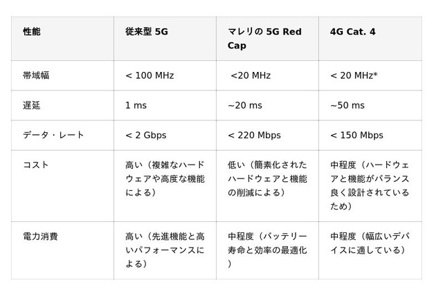 5G RedCapテレマティクスの特徴(4Gおよび従来型5Gとの比較)