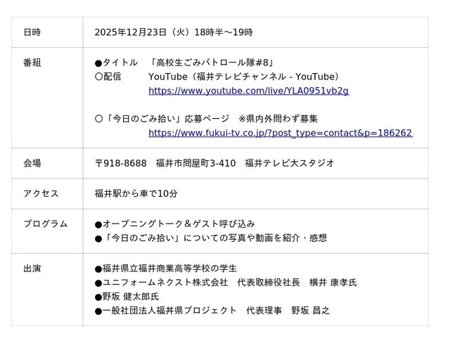 一般社団法人福丼県プロジェクトは、2025年12月23日(火)に「高校生ごみパトロール隊」生配信の8回目を放送いたします。この生配信は、日本財団が推進する海洋ごみ対策プロジェクト「海と日本プロジェクト・CHANGE FOR THE BLUE」の一環で開催するものです。