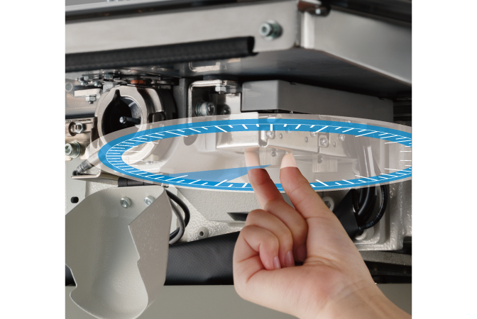 調整状態をパネルで確認できるため、縫製不良が発生した際には原因を特定し、適切な調整を迅速に行うことができる。また、設定した目標値と本体の現在値をパネル上で確認しながら、針棒高さ位置や針と剣先の隙間、針と釜の出会うタイミングなどを0.01mm単位で容易に調整できる。これにより、縫製不良や人・環境による精度のばらつきを防止し、従来機と比べて調整時間を大幅に短縮することで、ミシンの稼働率向上に貢献する。さらに、調整状態がデジタル化されているため、異なる工場でも同じ調整を再現することが可能。