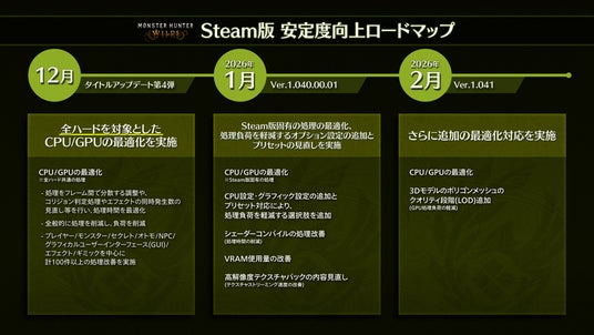 12月16日(火)のタイトルアップデート第4弾をもって『モンスターハンターワイルズ』での新たな追加モンスターを含む大型アップデートは最後となります。タイトルアップデート第4弾以降も、Steam版の安定度の向上を目的としたパッチ配信や、2026年2月18日(水)に歴戦王の追加を含む最終アップデートを予定しています。