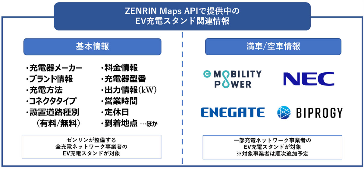 株式会社ゼンリン(本社:福岡県北九州市、代表取締役社長:竹川道郎、以下ゼンリン)は、地図API「ZENRIN Maps API」にて提供中の、満車・空車状況をリアルタイムで確認できる「EV充電スタンド満空情報配信機能」に、新たに株式会社e-Mobility Powerの約25,600口※1の情報を追加しました。これにより本APIは、現在提供中の株式会社エネゲート、日本電気株式会社、BIPROGY株式会社の情報と合わせて、約28,000口※2の満空情報配信が可能な、国内最大規模のサービスとなります。