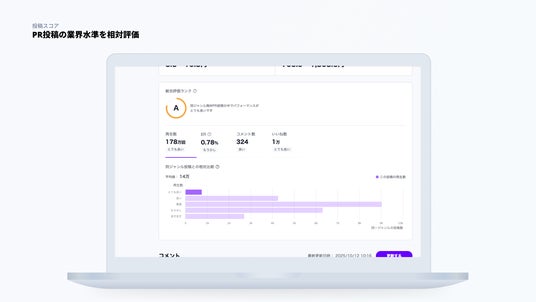 同一ジャンルのPR投稿におけるパフォーマンスを独自のAI指標で算出し、目安となる基準値をランク形式で表示します。これにより、「このPR投稿がジャンル全体の中でどの程度の成果か、優位性があるか」を客観的かつ直感的に把握できます。