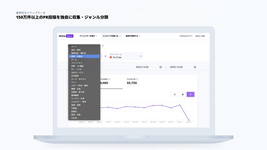 本機能は、SNS上に存在するPR投稿の動向をより正確かつ戦略的に把握するために開発されました。商材ジャンル別に整理された150万件以上のPR投稿データを基に、競合・同ジャンルにおける投稿パフォーマンスの基準値や傾向を可視化します。これにより、企業・代理店は、経験や勘に頼らず、 より精度の高い施策設計やクリエイター選定を行えるようになります。