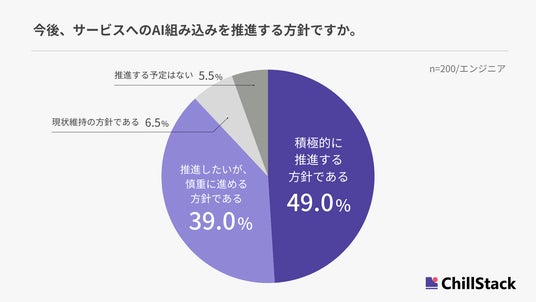 今後、サービスへのAI組み込みを推進する方針かどうかを尋ねたところ、「積極的に推進」が49.0%、「慎重に推進」が39.0%となり、あわせて88.0%が拡大の意向を示しました(n=200/エンジニア)。