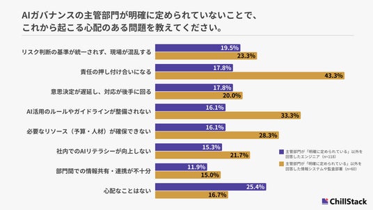 一方、情報システムや監査部署の回答を見ると、「責任の押し付け合いになる」が43.3%と突出して高く、「AI活用のルールやガイドラインが整備されない」が33.3%、「必要なリソース(予算・人材)が確保できない」が28.3%と続きました(n=60/主管部門が「明確に定められている」以外を回答した情報システムや監査部署)。
