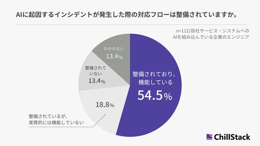 AIに起因するインシデントが発生した際の対応フローが整備されているかを尋ねたところ、「整備されており、機能している」が54.5%で最も多く、「整備されているが、実質的には機能していない」が18.8%、「整備されていない」が13.4%と続きました(n=112/自社サービス・システムへのAIを組み込んでいる企業のエンジニア)。