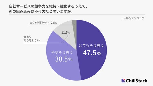 今後、自社サービスの競争力を維持・強化するために、AIの組み込みが不可欠か尋ねたところ、「とてもそう思う」と「ややそう思う」が合わせて86.0%となり、多くのエンジニアがAI実装の重要性を認識していることがわかりました(n=200/エンジニア)。