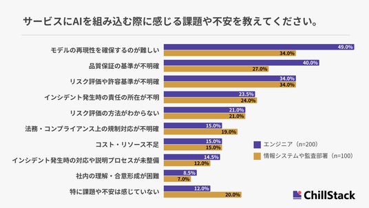 AIを自社サービス・システムに組み込む際の課題・不安を尋ねたところ、エンジニアは「モデルの再現性確保の難しさ(※1)」が49.0%で最も多く、「品質保証の基準が不明確(※2)」が40.0%、「リスク評価や許容基準の不明確さ(※3)」が34.0%と続きました(n=200/エンジニア)。