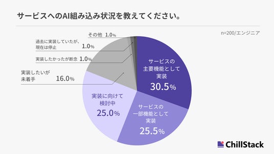 自社サービス・システムへのAIの組み込み状況を尋ねたところ、「サービスの主要機能として組み込んでいる」が30.5%、「一部機能として組み込んでいる」が25.5%で、あわせて56.0%がすでにAIを組み込んでいることがわかりました(n=200/エンジニア)。