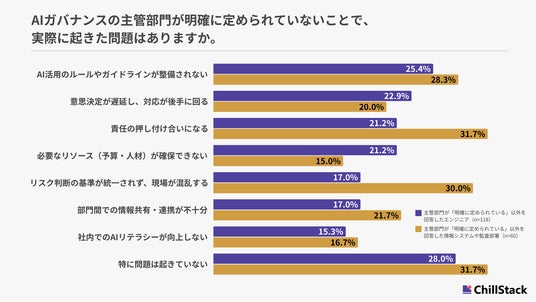 AIガバナンスの主管部門が明確に定められていない企業のうち、「特に問題は起きていない」と回答したのは、エンジニアで28.0%、情報システムや監査部署で31.7%でした。この結果、主管部門が未整備・機能不全の企業においては、約7割で既に何かしらの問題が起きている実態が明らかになりました。