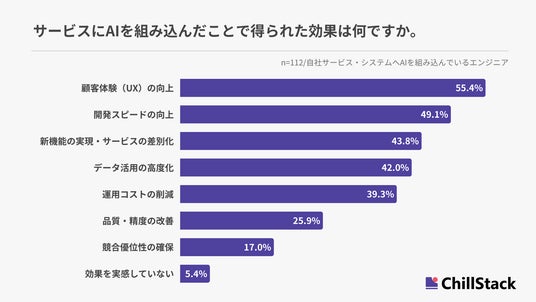 AIを自社サービス・システムに組み込んだことで得られた効果を尋ねたところ、「顧客体験の向上」が55.4%で最も多く、「開発スピードの向上」が49.1%、「新機能実現・サービス差別化」が43.8%と続きました(n=112/自社サービス・システムへAIを組み込んでいるエンジニア)。