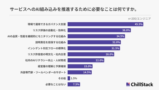 AI組み込みを推進するうえで必要なことを尋ねたところ、「現場で運用できるガバナンス支援」が45.5%で最も多く、「リスク評価の自動化・効率化」が38.0%、「品質モニタリング」が34.5%と続きました。(n=200/エンジニア)。