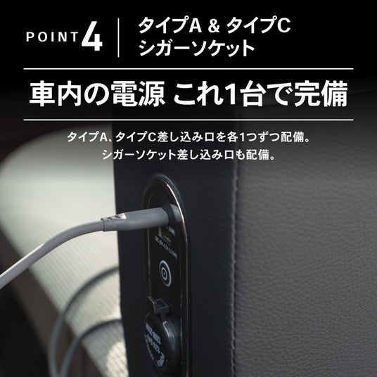 タイプA、タイプC差し込み口を各1つずつ配備。シガーソケット差し込み口も配備。
