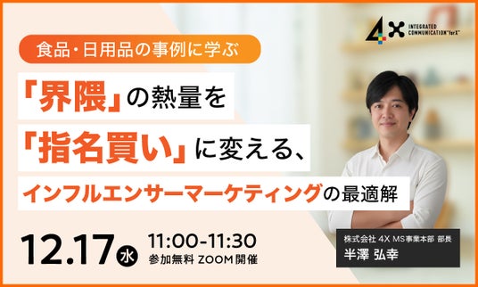 ブランドと社会をつなぐ伴走型コミュニケーションカンパニーとして、戦略設計からWeb、SNS、動画などコンテンツにまつわるあらゆる施策を提供する株式会社4X(本社:東京都中央区、代表取締役社長:家口 寛、以下「4X」)は、12月17日(水)11時~開催のウェビナー「【食品・日用品の事例に学ぶ】 「界隈」の熱量を「指名買い」に変える、インフルエンサーマーケティングの最適解」を開催いたします。