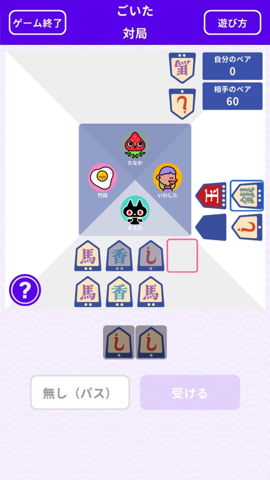 ごいたの最大の特徴は「2人対2人の協力対戦」であること。また、「対局中は駒に関する会話禁止」というルールにより、駒の出し方だけで仲間の意図を読み取る高度な連携と駆け引きが生まれます。
