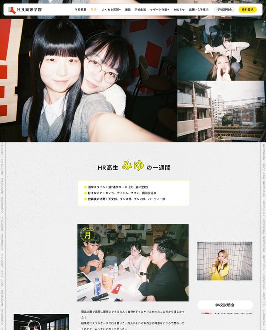 HR高生の一日の過ごし方や、YOYOGI BASE(代々木キャンパス)での学校生活の様子を紹介するコンテンツを新設。実際の学校生活がイメージできる情報を充実させました。